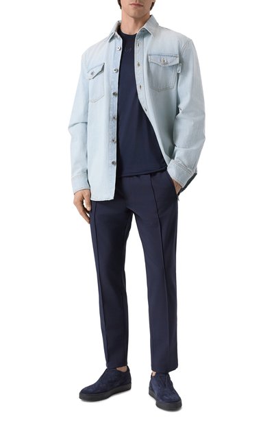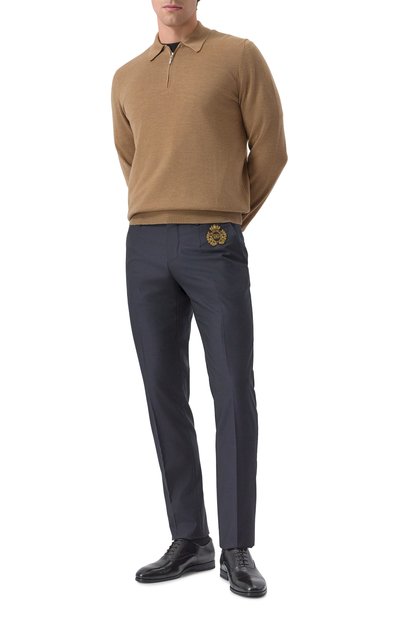 Брюки с простроченными стрелками сшили из текстиля с шевронным узором, сотканного из хлопка и вискозы. Модель с эластичным поясом-кулиской дополнили тремя карманами на молниях, украсив задний брендированным кожаным патчем.
