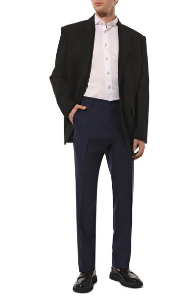 Брюки с простроченными стрелками сшили из текстиля с шевронным узором, сотканного из хлопка и вискозы. Модель с эластичным поясом-кулиской дополнили тремя карманами на молниях, украсив задний брендированным кожаным патчем.