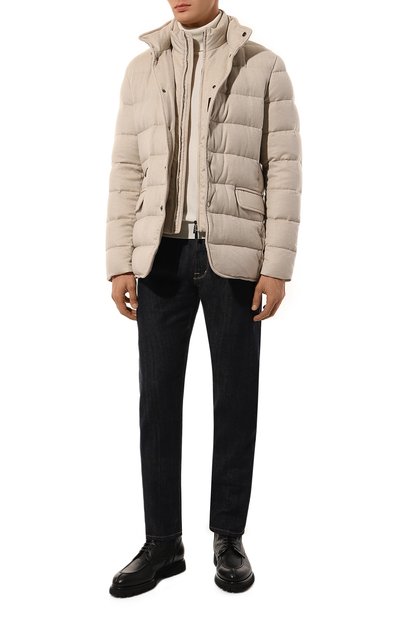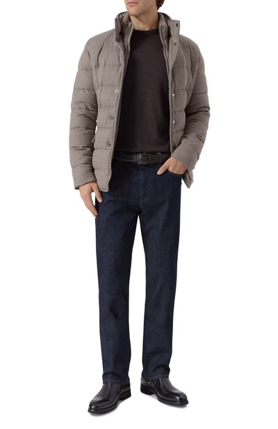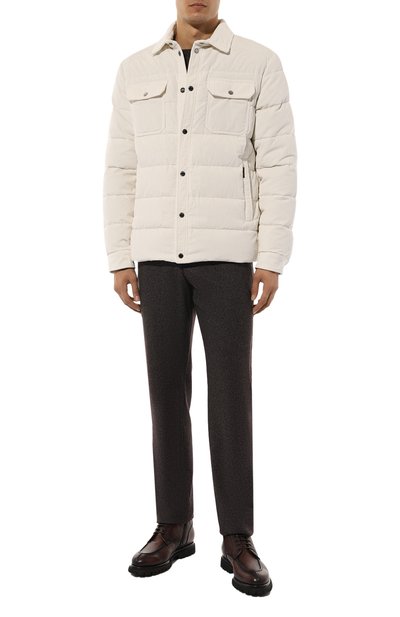 Бомбер с двумя карманами, утепленный утиными пухом и пером, можно носить двумя способами: стеганой стороной из хлопка или гладкой из полиэстера. Куртка с трикотажными манжетами, поясом и воротником-стойкой застегивается кнопками.