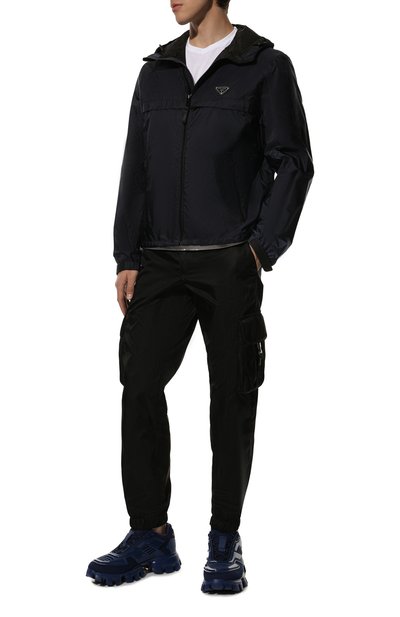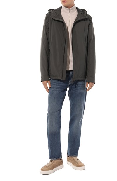 Куртку из шерстяного материала дополнили вставкой, напоминающей выглядывающую ветровку. Модель с капюшоном и кулиской снизу, как и боковые карманы, застегивается молнией. Спереди изделие украсили фирменным патчем.
