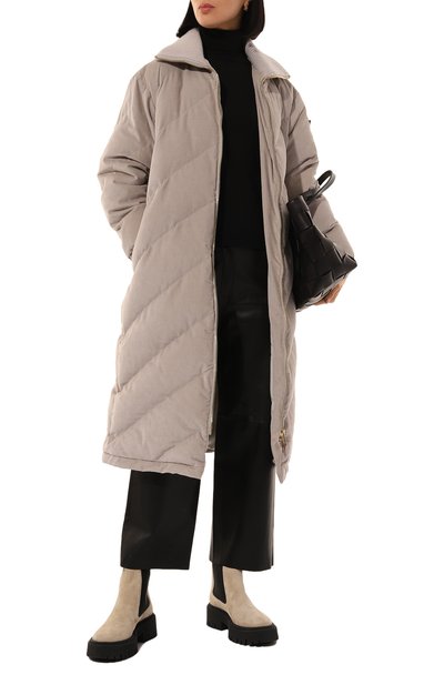 Стеганую куртку Long Bear из коллекции Masterpiece выполнили из переработанного нейлонового оксфорда с ламинированием и влагоотталкивающей обработкой. Боковые разрезы и сама модель на утином пуху застегиваются молниями. Воротник изделия с брендированным патчем на рукаве можно регулировать фирменным крючком, а низ — шнурами в кулиске. Пуховик с двумя карманами дополнили съемным капюшоном.