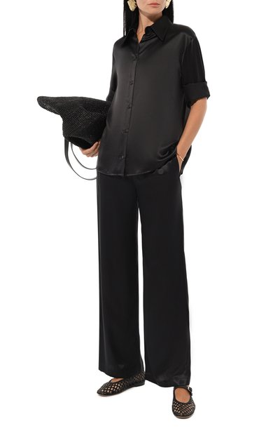 Брюки с шелковистым эластичным поясом-кулиской выполнили из хлопкового трикотажа с добавлением полиэстера. Сзади модель с двумя карманами украсили брендированной нашивкой.