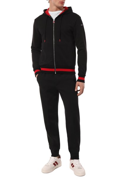 Брюки с эластичным поясом-кулиской и отутюженными стрелками сшили из шерстяного трикотажа. Манжеты на резинке дополнили молниями, а один из четырех карманов подчеркнули монограммой SR.