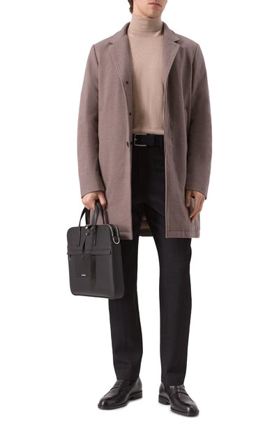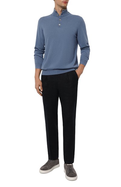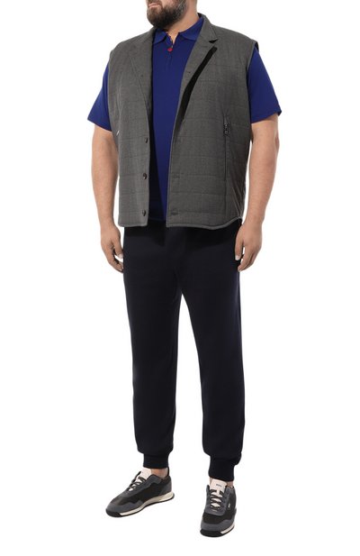 Брюки с эластичным поясом-кулиской и отутюженными стрелками сшили из шерстяного трикотажа. Манжеты на резинке дополнили молниями, а один из четырех карманов подчеркнули монограммой SR.