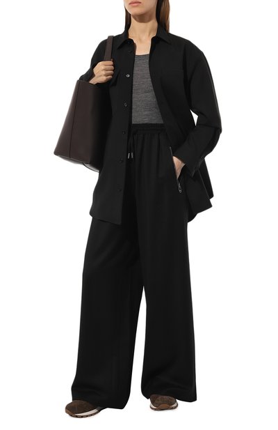 Широкие брюки выполнили из тонкой мягкой наппы. Модель с боковыми и задними карманами дополнили узким ремнем с пряжкой-эмблемой, дважды охватывающим талию.