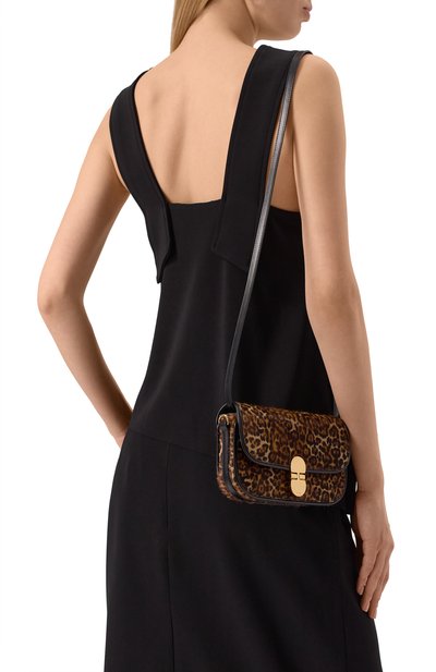 Сумку Tie Me с плечевым ремнем, трансформирующимся в короткую ручку, выполнили из замши. Аксессуар с внутренним брендированным слотом застегивается молнией.