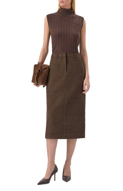 Облегающий топ с глубокими проймами и высоким воротом легко впишется в повседневные образы разной сложности. Модель, декорированную микропайетками, связали узором в рубчик из шелковой пряжи с добавлением шерсти.