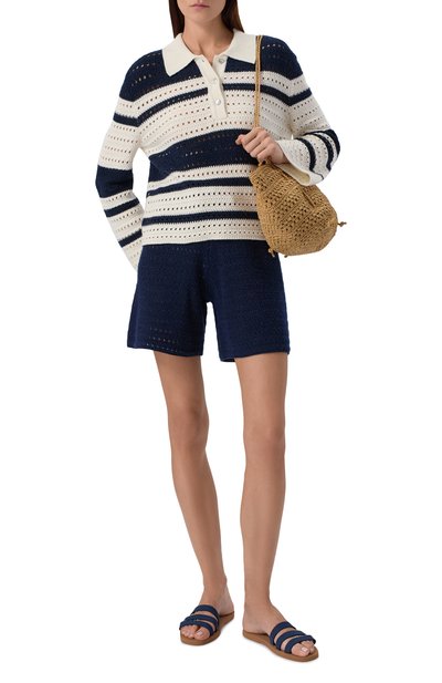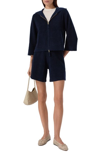 Шорты с широким поясом-кулиской сшиты из футера на основе органического хлопка. Сбоку модель с накладным и двумя врезными карманами украшена брендированным патчем.