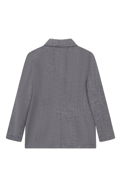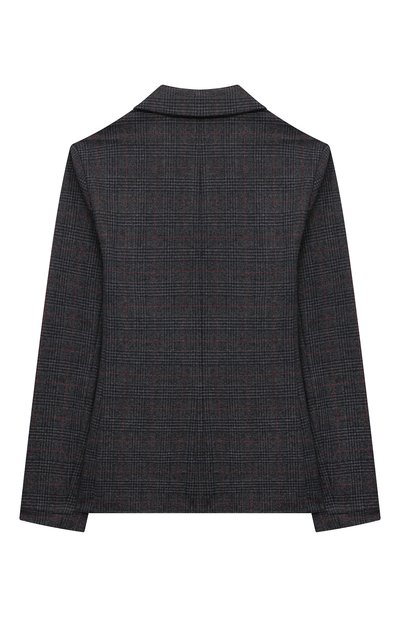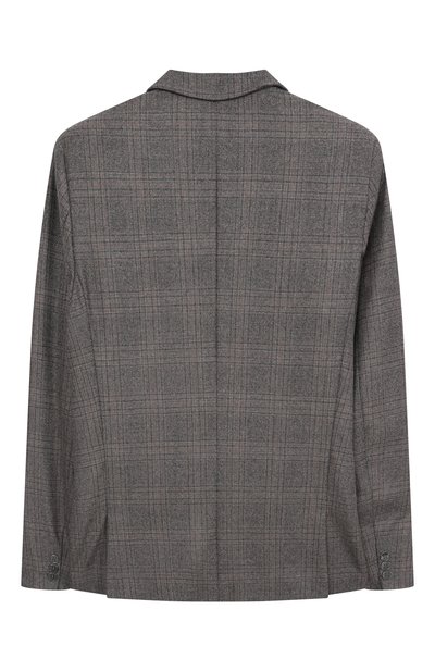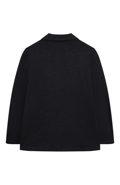 Однобортный пиджак с шевронным узором выполнили из ткани на основе шерсти. Модель на шелковистом подкладе украсили небольшим вышитым логотипом. По бокам предусмотрели врезные карманы с клапанами.