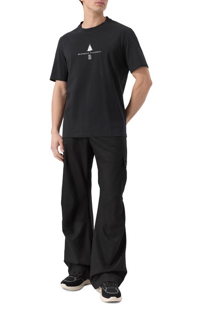Футболку с рифленой горловиной выполнили из хлопкового джерси. Модель со спущенной линией плеч украсили фирменной монограммой BB и логотипом спереди.