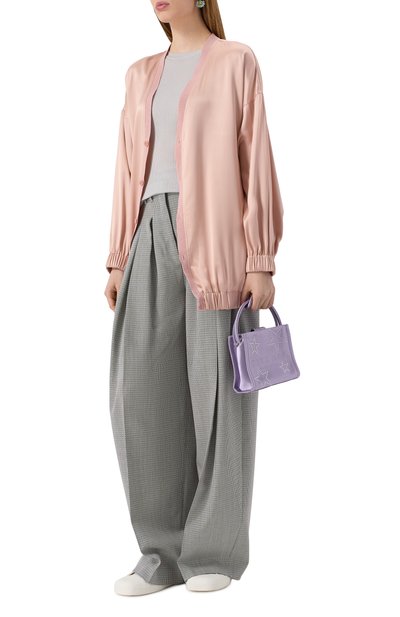 Кардиган из кашемира и шелка украсили полупрозрачными вставками с растительной вышивкой. Скрывающую застежку планку продублировали лентой грогрен в тон.