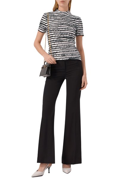 Топ прямого кроя выполнили из тонкой ткани на основе вискозы и шерсти. Модель с круглым вырезом и пуговицей сзади декорировали широкой фигурной вставкой из полупрозрачного цветочного кружева.