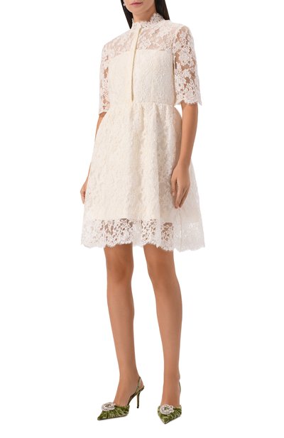 Длинное платье с завышенной талией, глубоким V-образным вырезом и потайной молнией на спинке выполнили из тонкого шелкового жоржета в мелкий горох. Модель с мягкими складками на расклешенном подоле дополнили на лифе асимметричной драпировкой-пелериной.