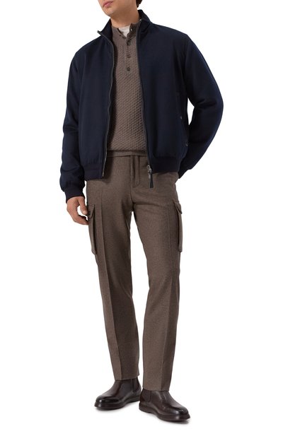 Челси с текстильной брендированной петлей на укороченном голенище выполнили из зернистой кожи. Ботинки на наборной подошве декорировали искусственными потертостями, придав ей состаренный вид.