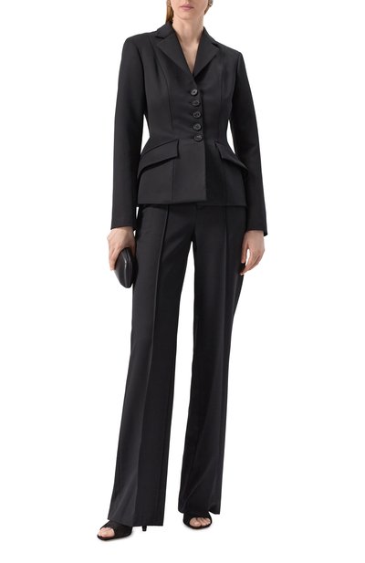 Брюки с высокой посадкой и широким поясом со шлевками сшили из вискозы в вертикальную полоску. Модель прямого кроя дополнили врезными боковыми и асимметричными задними карманами.
