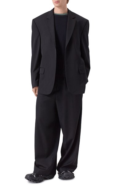 Однобортный пиджак силуэта oversize сшили из гладкой шерсти. Широкий лацкан украсили фирменным шнуром с брендированной вставкой. Модель с высокой шлицей дополнена тремя врезными карманами.