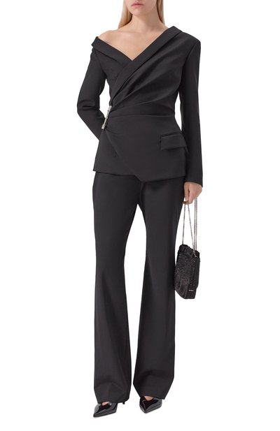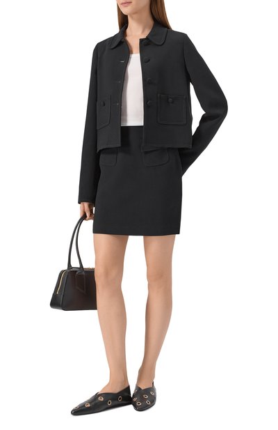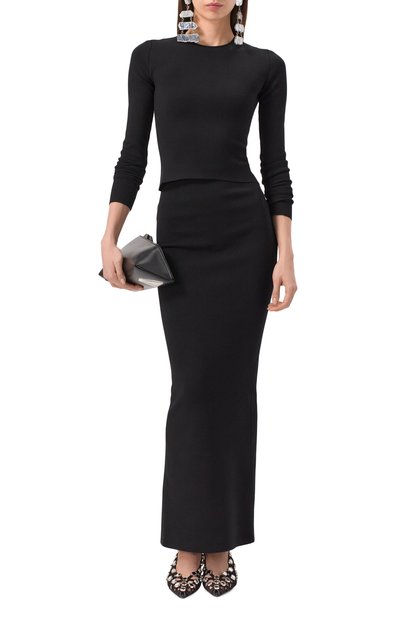 Топ с асимметричным низом выполнили из вискозного жаккарда с полосатым мотивом. Спинку модели дополнили фирменными лентами грогрен с брендированной накладкой, позволяющими формировать драпировки.