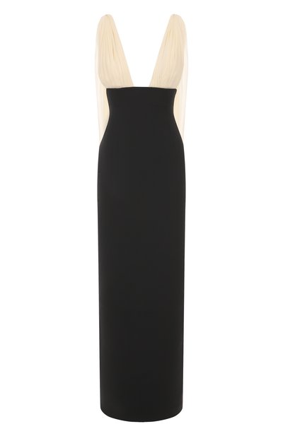 Платье Mara со шлицей и потайной молнией сзади выполнили из шерсти первого пострига с добавлением эластана и нейлона. Лиф модели с тонкими бретелями и ниспадающую шаль на спинке изготовили из шелкового жоржета стрейч.