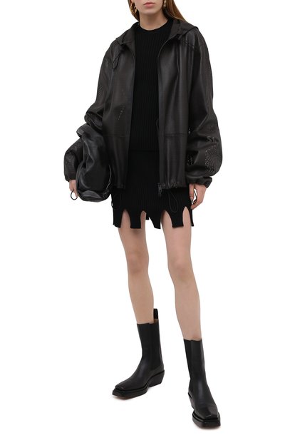 Свободную куртку с рукавами реглан и двумя боковыми карманами выполнили из мелкозернистой кожи. Капюшон и низ модели можно регулировать шнурами, продетыми в кулиски.