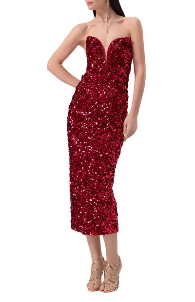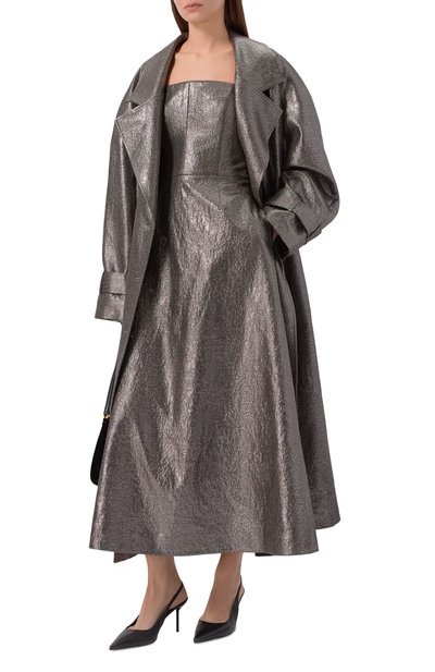 Мини-платье с открытой линией плеч выполнили из материала, напоминающего зернистую кожу. Модель с драпировками спереди застегивается потайной молнией на спинке.