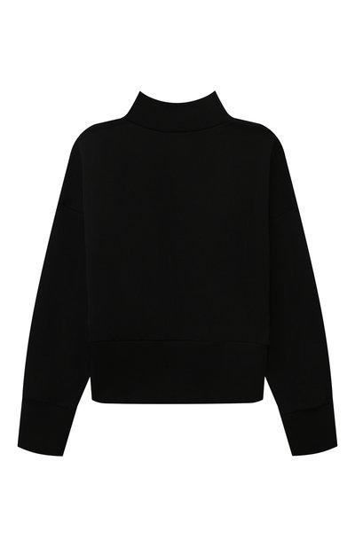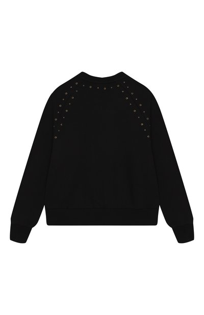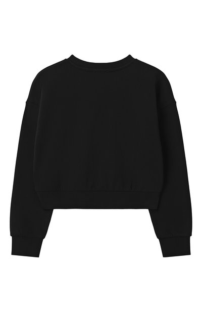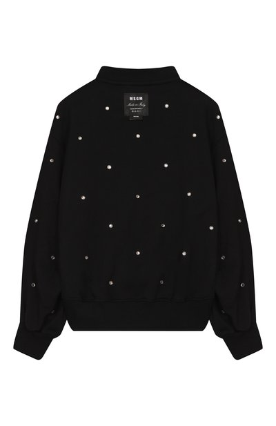 Для изготовления свитшота с круглой горловиной использовали хлопковый трикотаж. Фирменному декору, сочетающему принт и нашивки, добавили объем вышивкой перламутровыми бусинами.