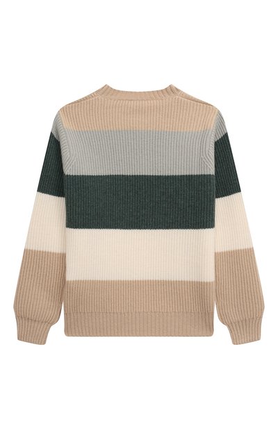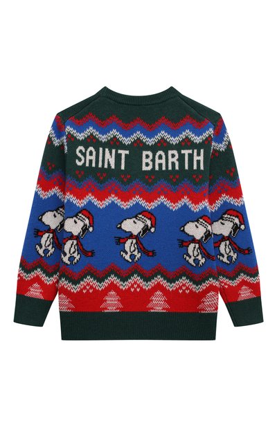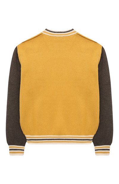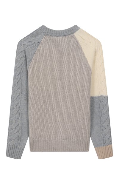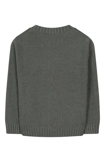 Свитер с жаккардовым шахматным узором выполнили из микса шерсти и хлопка, соединив детали вручную широкими стежками. Модель украсили вышитым логотипом спереди, фирменным смайлом на рукавах и изображением медведя на спинке.