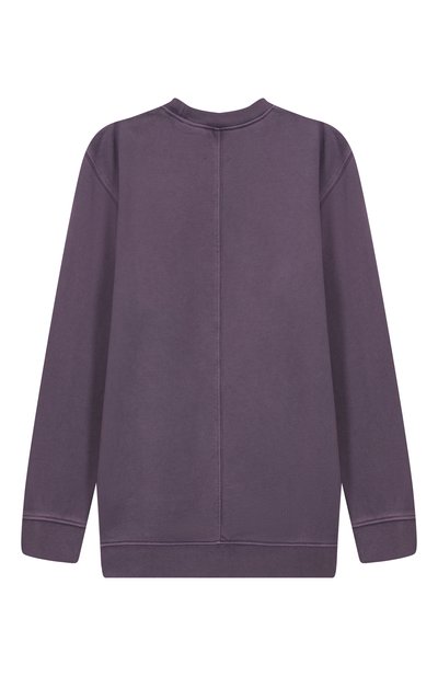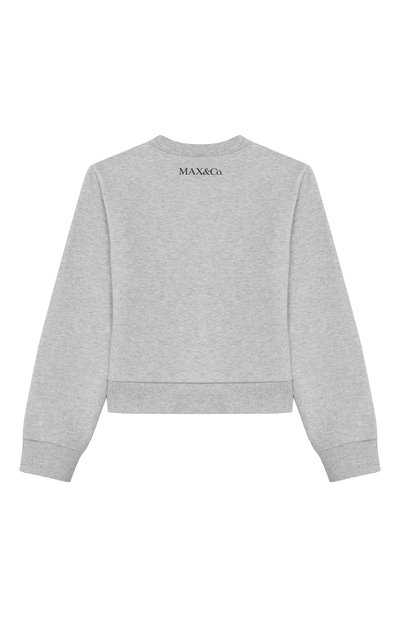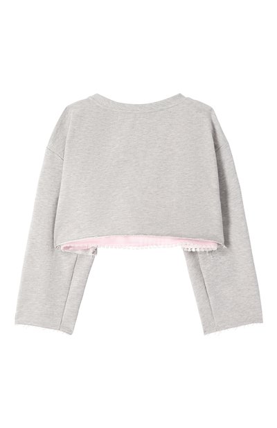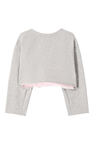 Свитшот с круглым вырезом, манжетами и поясом в рубчик сшили из хлопкового трикотажа. Спереди меланжевую модель украсили эмблемой марки из бусин и кристаллов.