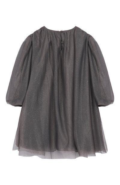 Платье со складками на расклешенном подоле выполнили из сетчатого тюля и шелковистого полиэстера. Модель с потайной молнией на спинке декорировали на лифе спереди паттерном из эмблем марки, выложенным прозрачными стразами.