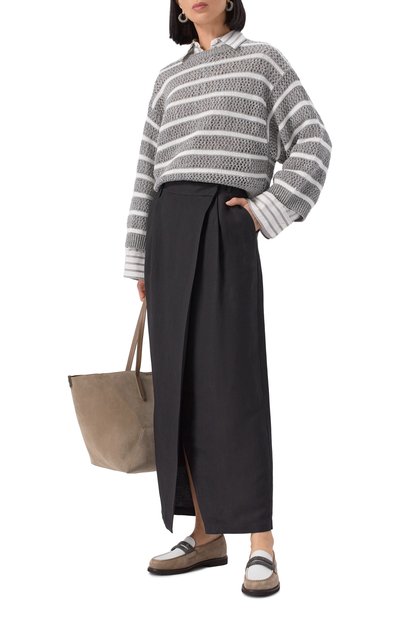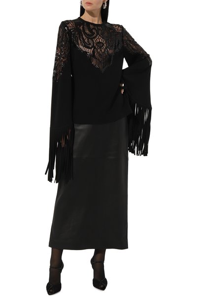 Юбку со шлицей сзади и потайной молнией сбоку выполнили из костюмной шерсти. Узкий пояс и съемный ремень с металлическими пряжкой и эглетами изготовили из кожи.