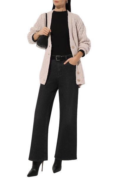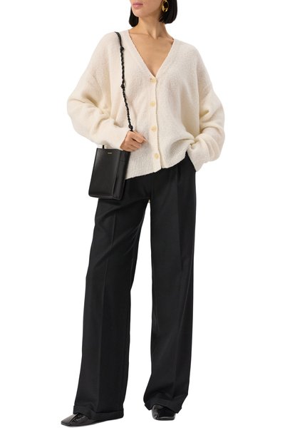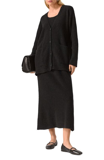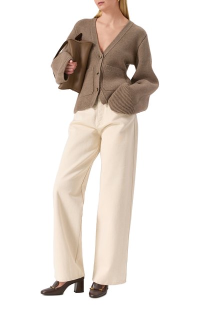 Кардиган связали английской резинкой из кашемировой пряжи. Oversize-модель с V-образным вырезом и накладными карманами украсили фирменной пластиной под горловиной сзади.