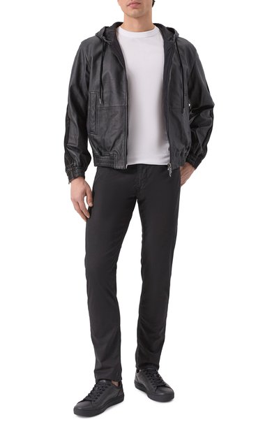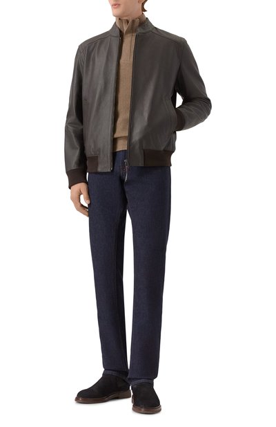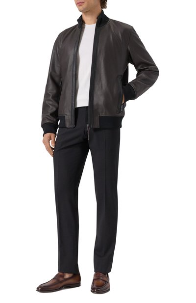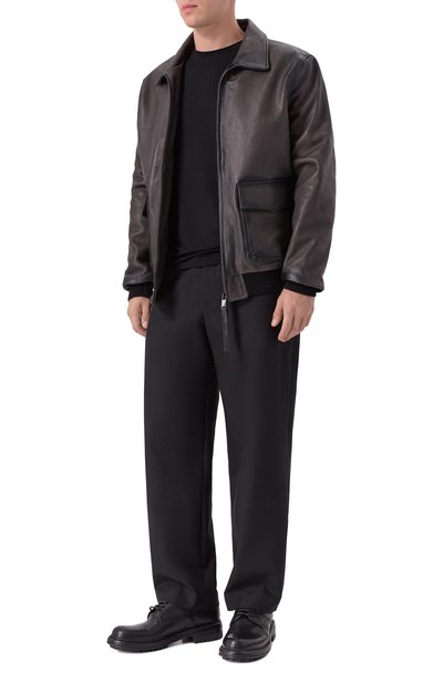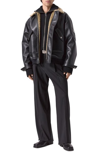 Бомбер с трикотажными манжетами и поясом в рубчик выполнили из гладкой кожи. Модель с отложным воротником из стриженой овчины дополнили накладными боковыми карманами с двумя входами.