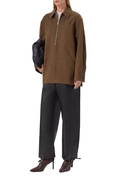 Для пошива широких брюк с высокой посадкой использовали матовую кожу. Модель с потайной застежкой дополнили боковыми врезными и задними накладными карманами.