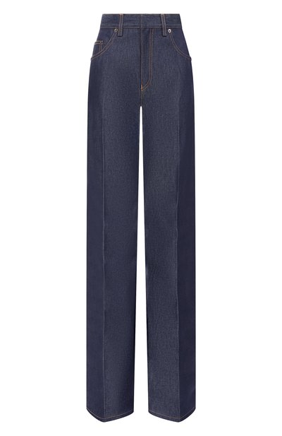 Джинсы с высокой посадкой сшиты из хлопкового денима. Расклешенная модель с пятью карманами и стрелками удачно дополнит повседневный гардероб.