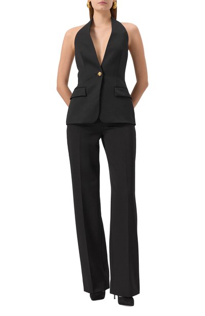Для изготовления полуприталенного жакета на встречной молнии использовали костюмную ткань из шерсти первого пострига. Модель дополнили боковыми карманами, передними с клапанами и нагрудным, декорированным пластиной с монограммой HL.