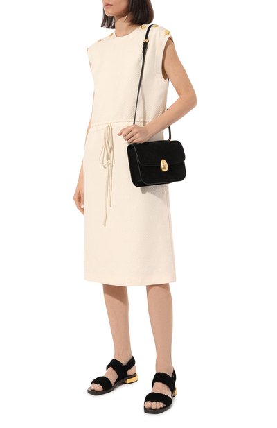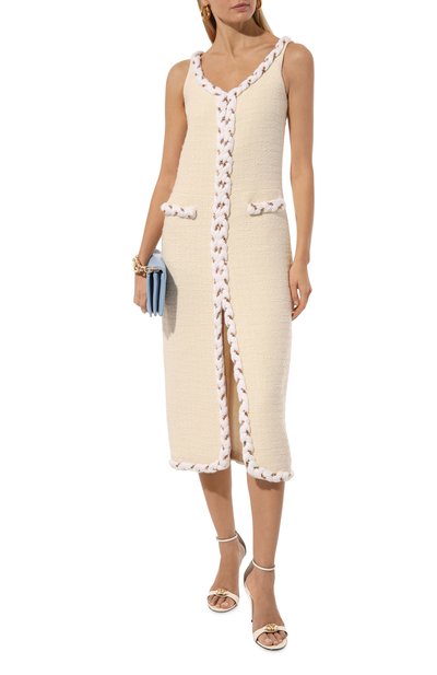 Длинное платье с высокой шлицей сзади и глубоким V-образным вырезом на спине выполнили из вискозы стрейч. Горловину изделия дополнили чокером с объемными птицами на концах.