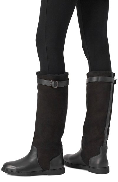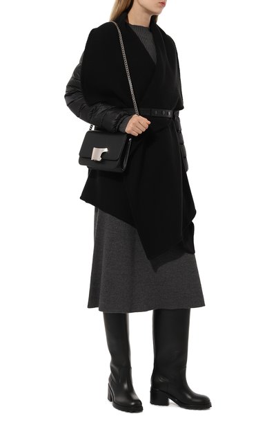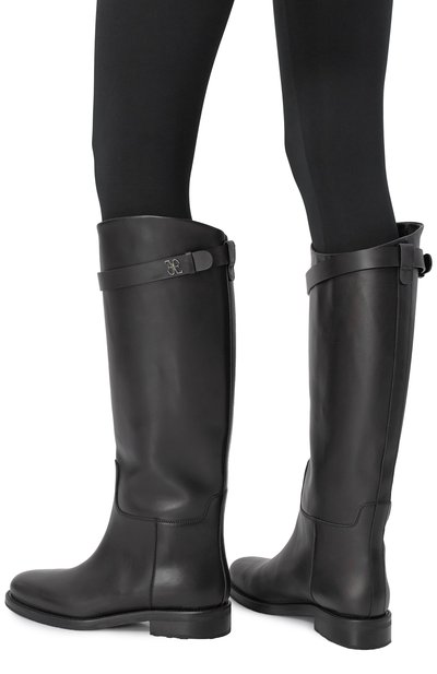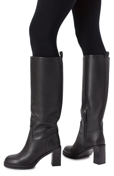 Сапоги на резиновой подошве с литым каблуком выполнили из гладкой кожи. Широкое голенище с укороченной молнией сбоку дополнили петлей.