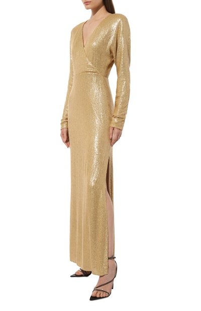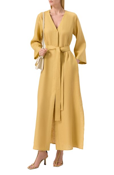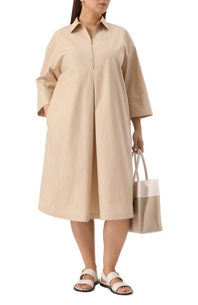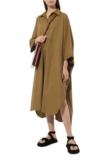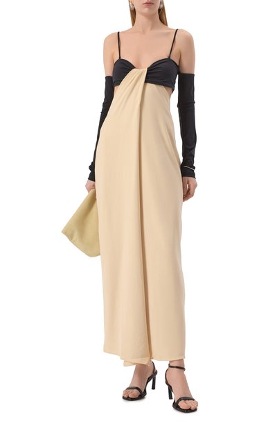 Платье D-Creed со спущенной линией плеч и запахом на лифе спереди выполнили из футера. Модель с регулируемыми кулисками на горловине и линии талии дополнили завязывающейся на бедрах вставкой из вискозного трикотажа, напоминающей сложенный платок.