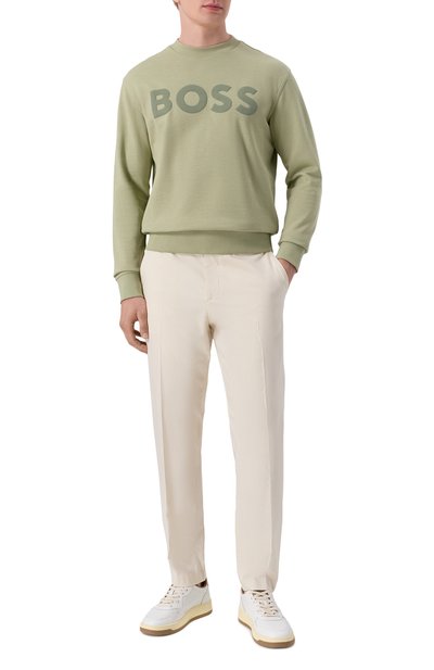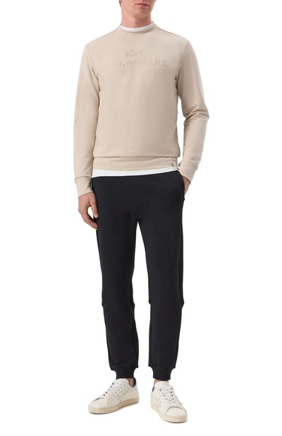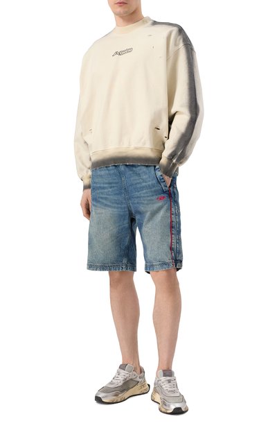 Свитшот S-Aron с круглой горловиной, манжетами и поясом в рубчик украшен логотипом и крупной эмблемой Diesel Phoenix, вырезанными лазером. Для пошива градиентной модели свободного кроя использовали трикотаж из полиэстера и органического хлопка.