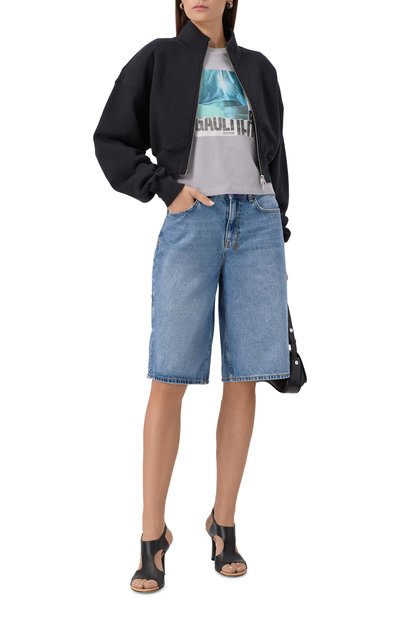 Выбеленную футболку T-Roweena со специально необработанными краями и выведенными наружу швами выполнили из джерси на основе органического хлопка. Модель с рукавами реглан украсили принтом Majestic phoenix and skulls, подчеркнутым стразами.