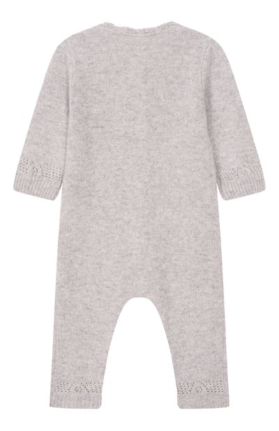Комбинезон комбинированной вязки выполнили из шерстяной пряжи. Модель с фирменным патчем на груди застегивается пуговицами в виде знакового медвежонка Teddy Bear, которым вторит небольшой патч спереди.