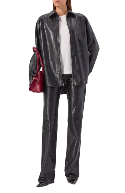 Рубашку с фигурным асимметричным низом выполнили из вискозы, расшитой пайетками. Модель с супатной застежкой дополнили двумя нагрудными карманами с клапанами.