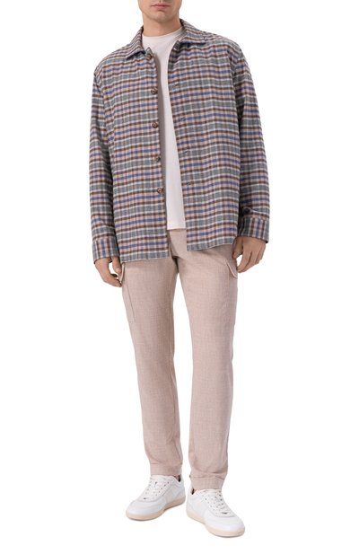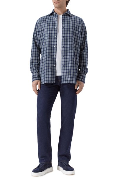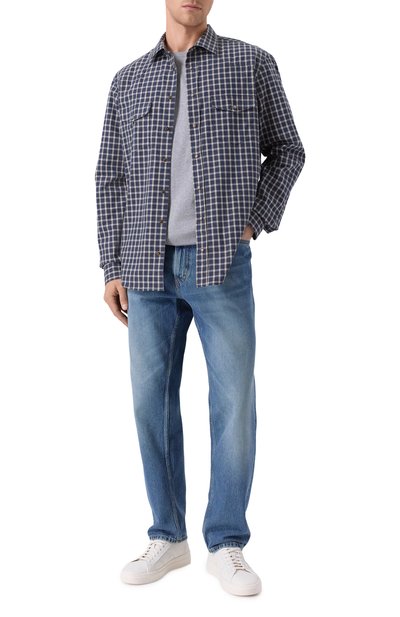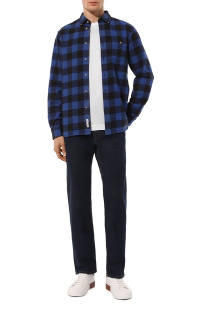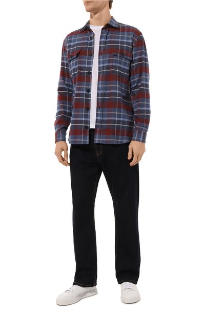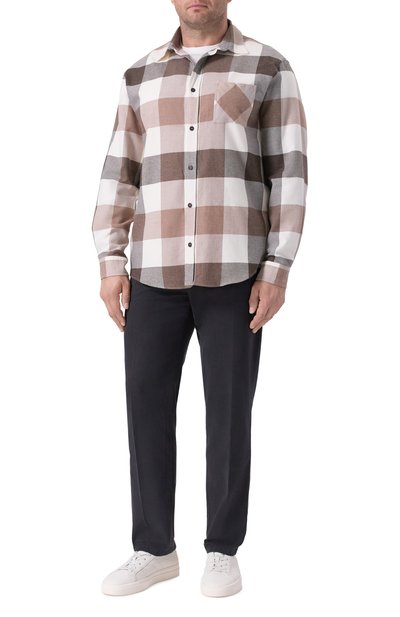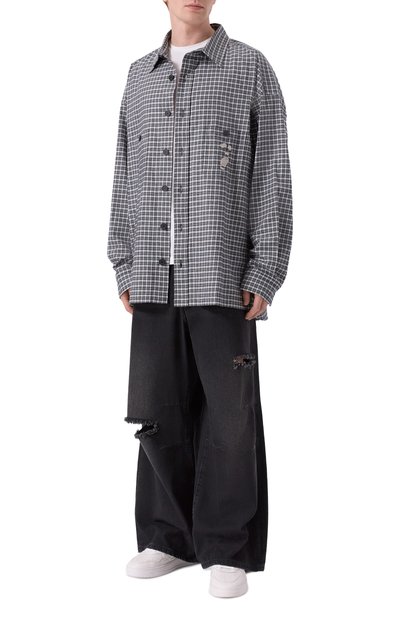 Клетчатую рубашку свободного кроя выполнили из хлопковой фланели. Спереди модель со спущенной линией плеч и закругленным подолом украсили вышитой эмблемой Oval D.