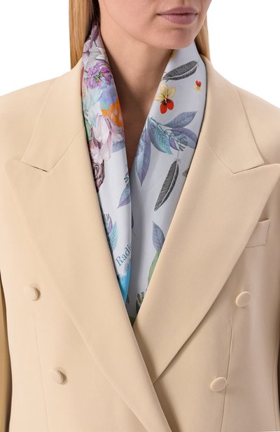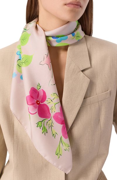 Платок с контрастным кантом и фирменной эмблемой, изображающей Жанну Ланван с дочерью, выполнили из шелкового твила. Края аксессуара аккуратно подшили роликом вручную.