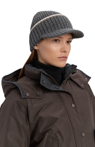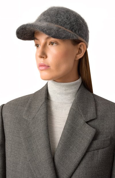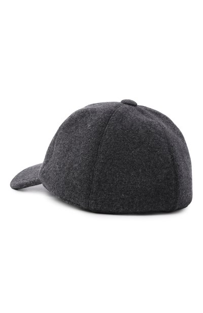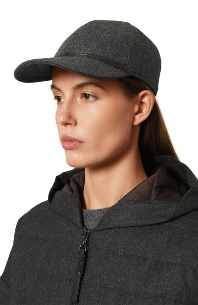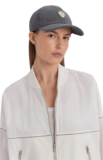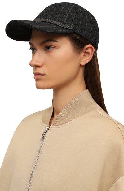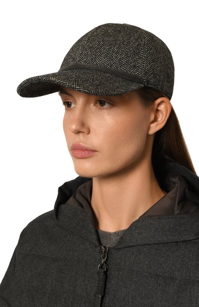 Бейсболку с креповым подкладом выполнили из шерстяной ткани в виндзорскую клетку. Посадку головного убора, украшенного фирменными цепочками мониль, можно регулировать кожаным ремешком с пряжкой.