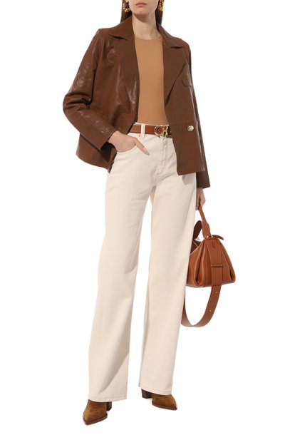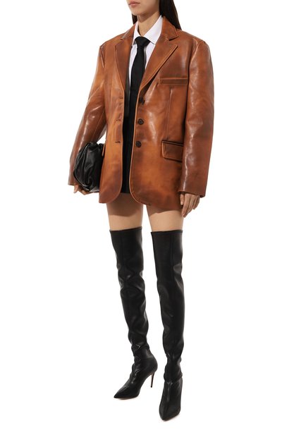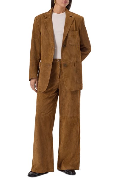 Удлиненный жакет с прямоугольными лацканами и шлицей сзади дополнили тремя карманами. Модель на атласном подкладе изготовили из замши, тонко выделанной вручную.