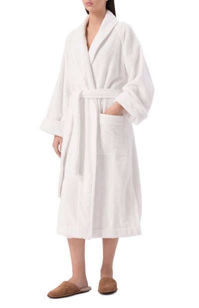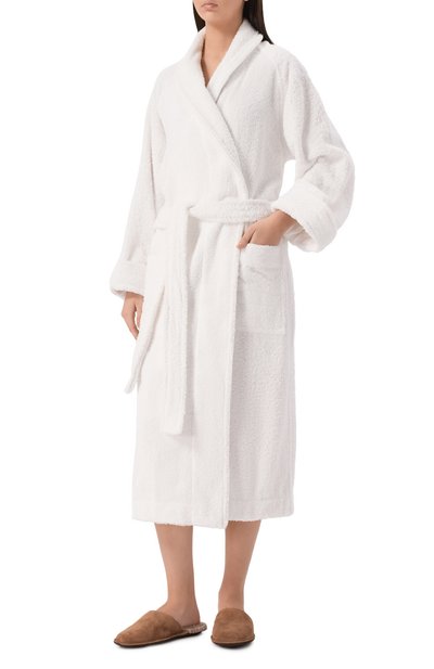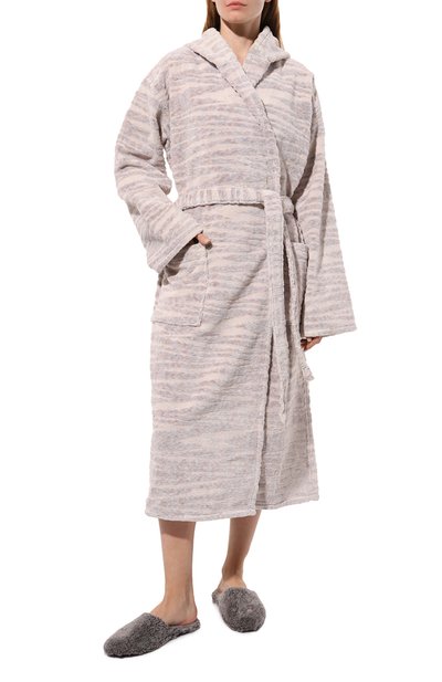 Халат выполнили из махрового хлопка с фирменным зигзагообразным узором. Модель с капюшоном и накладными карманами по бокам дополнили поясом-лентой.