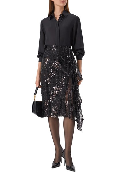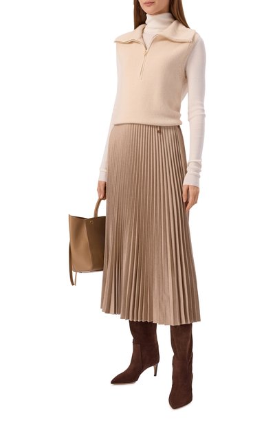 Плиссированную юбку с жаккардовым геометрическим узором выполнили из вискозного трикотажа, усиленного полиэстером и эластаном. Модель длиной ниже колен дополнили широким поясом.