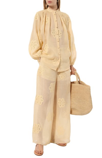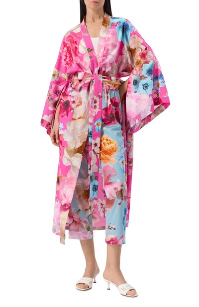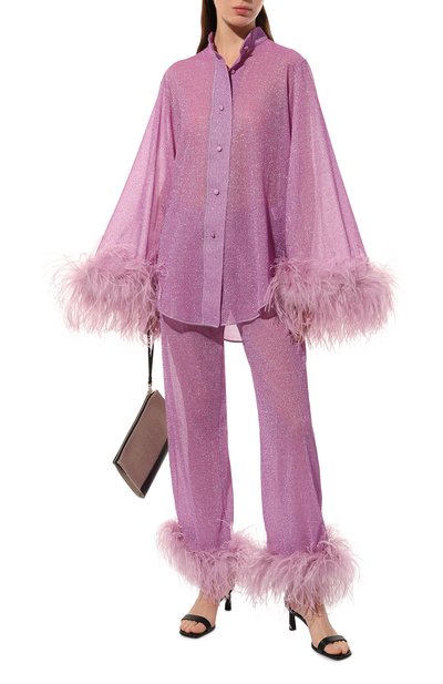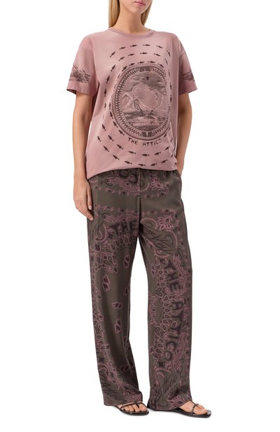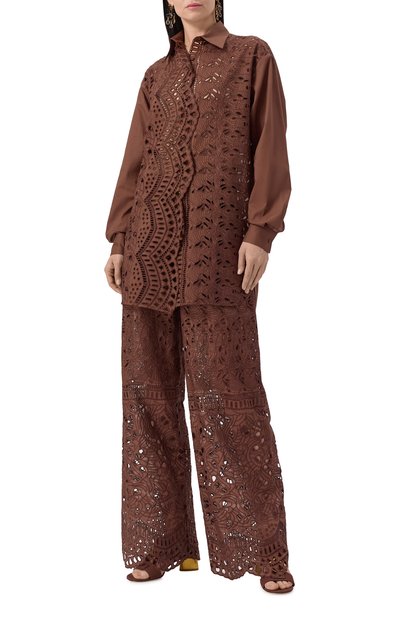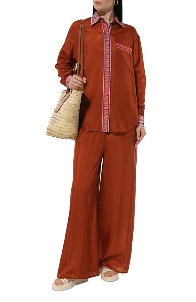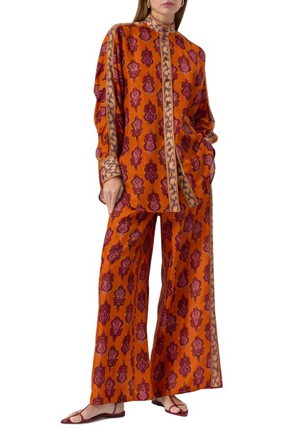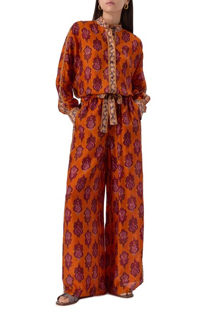 Брюки выполнили из фирменного полиэстерового трикотажа raschel с шевронным узором и разноцветными поперечными полосами в технике деграде. Модель с эластичным поясом составит гармоничный дуэт с парной туникой.