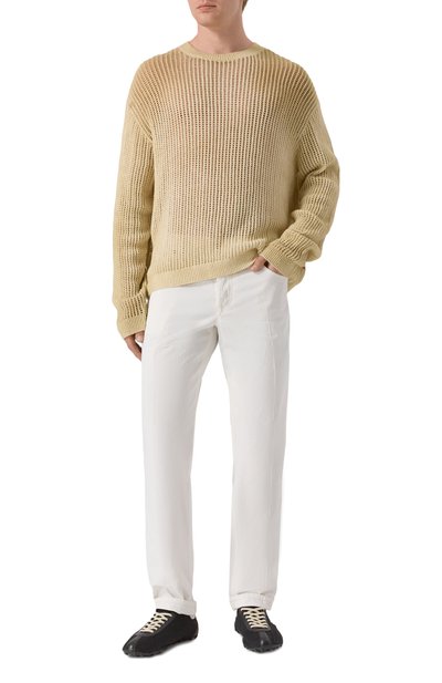 Свитер с высоким воротом выполнили из мериносовой шерсти, усиленной полиамидом. Связанную резинкой меланжевую модель дополнили манжетами и поясом в рубчик.