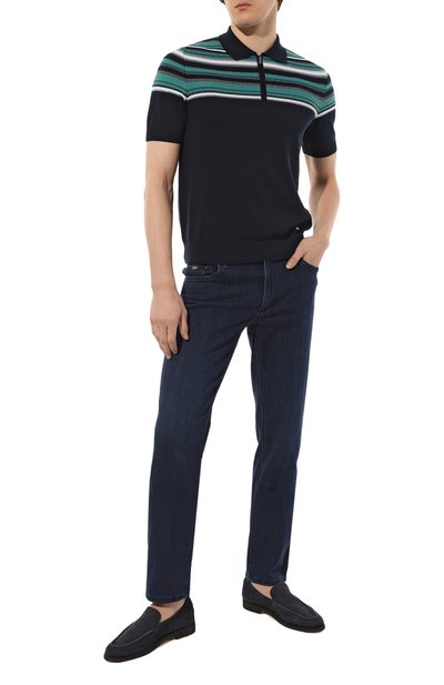 Джинсы с пятью карманами выполнили из хлопка с небольшим добавлением эластана. О принадлежности прямых брюк марке рассказали брендированным жакроном на поясе.